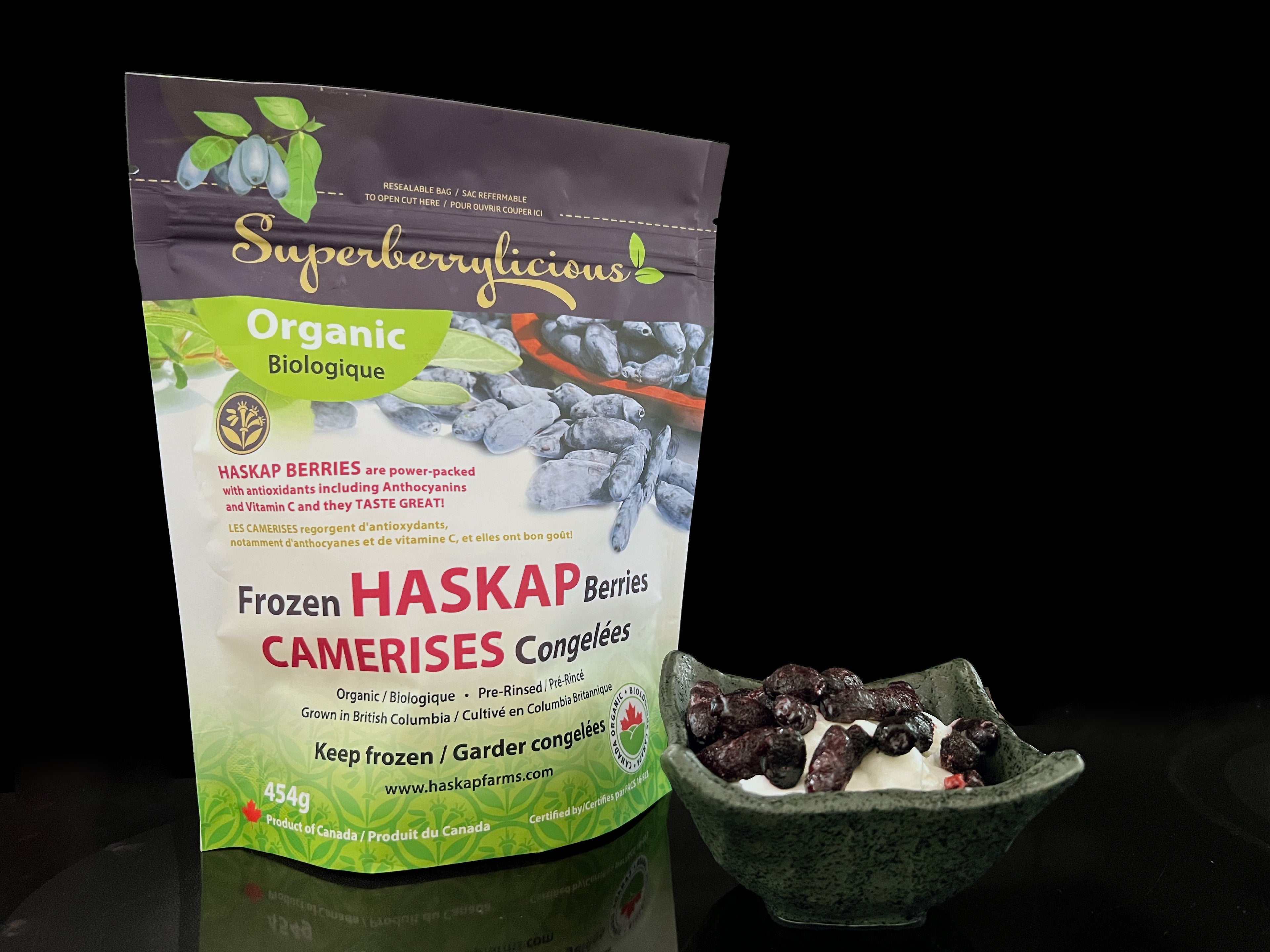 Slightly thaw berries and top ice cream or cheesecake. For more sweetness add haskap syrup.