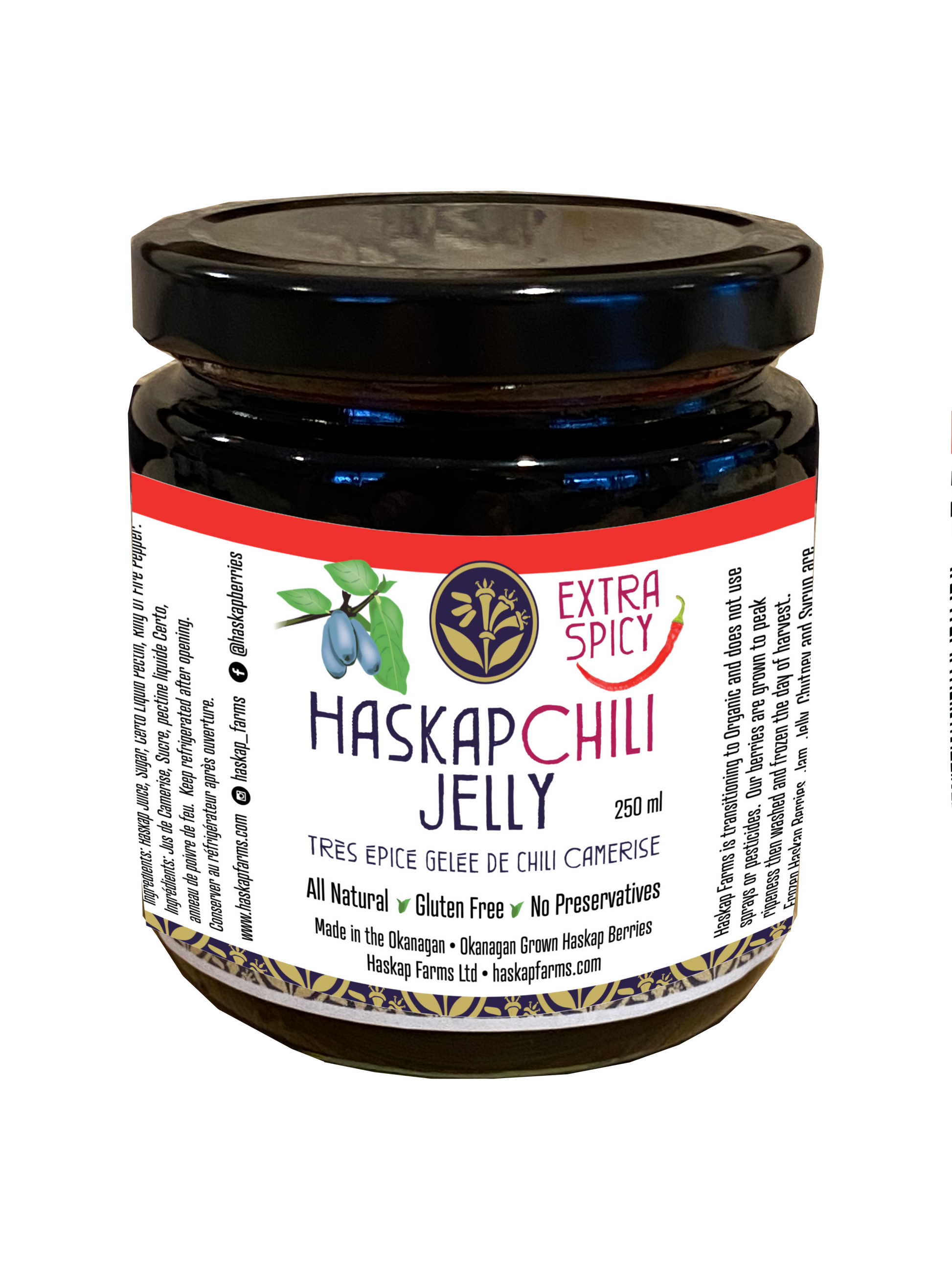 Extra spicy haskap berry jelly with chili pepper is smooth and sweet with an extra hit of heat. Haskap jelly is made with the undiluted juice of whole premium organic haskap berries and ring of fire pepper.
